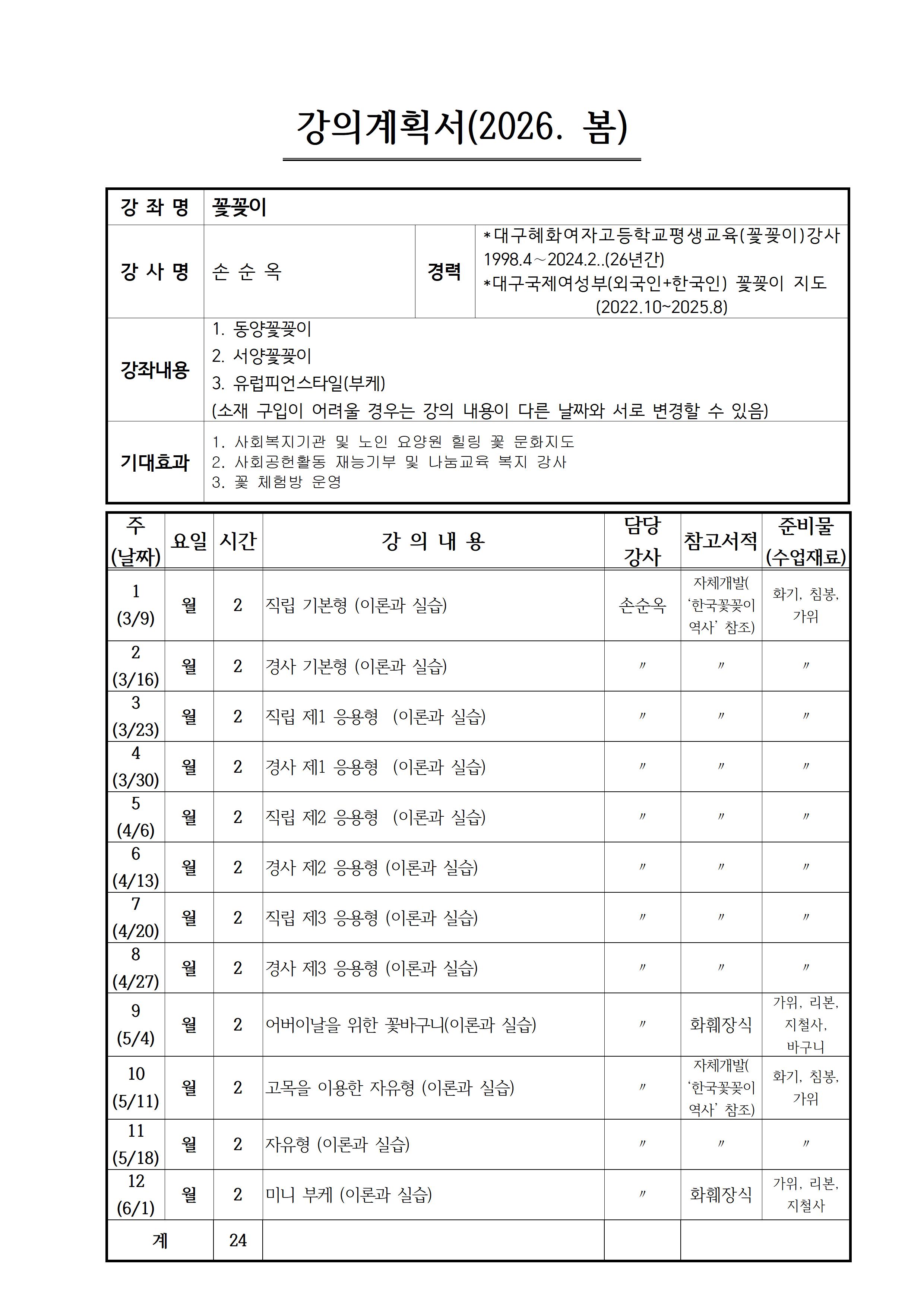 | 교육장소 | 경복관 405호 | 담당강사 | 손순옥 |