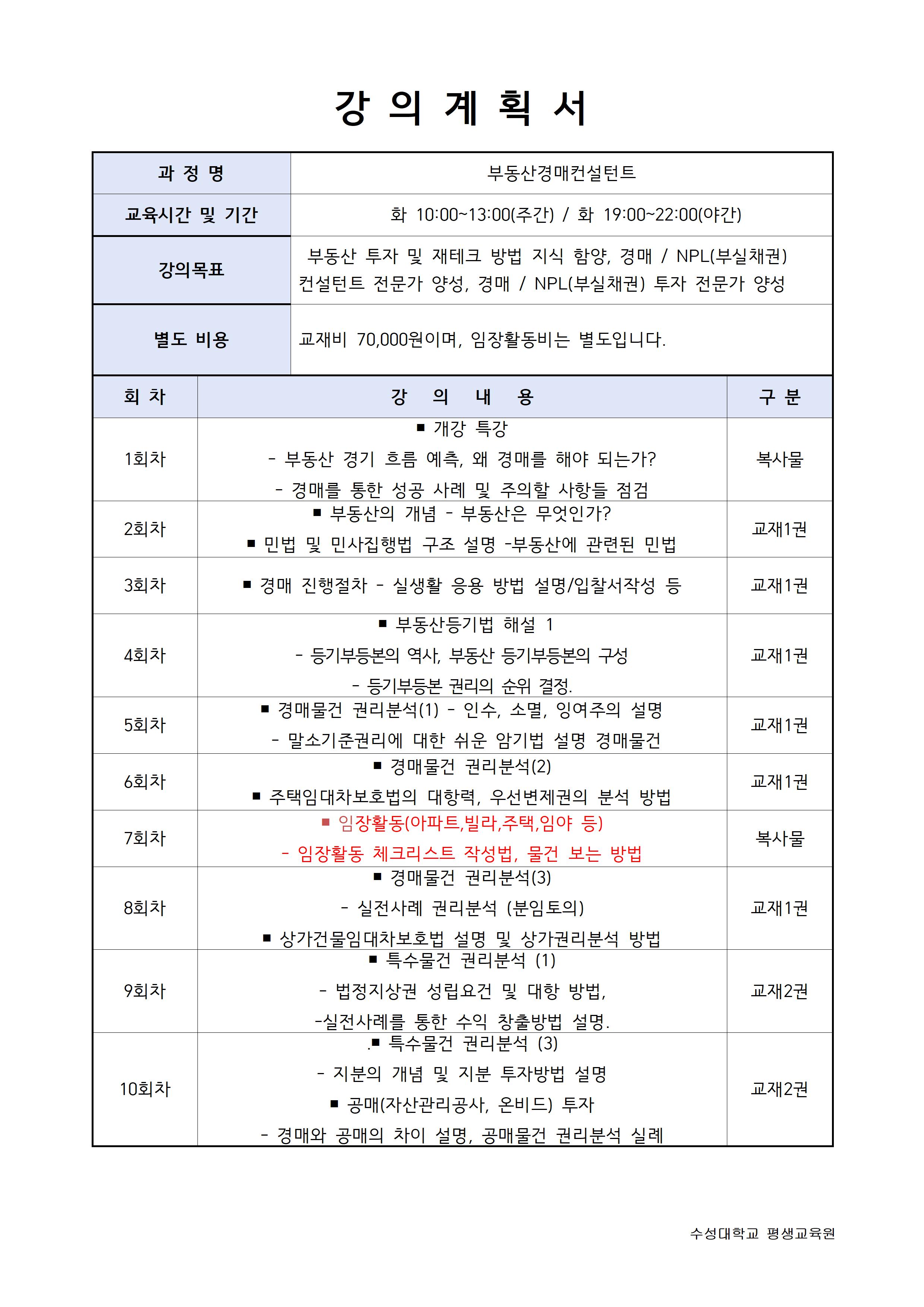 | 과정구분 | 일반교양과정 | 과정명 | 부동산경매컨설턴트(주간) |