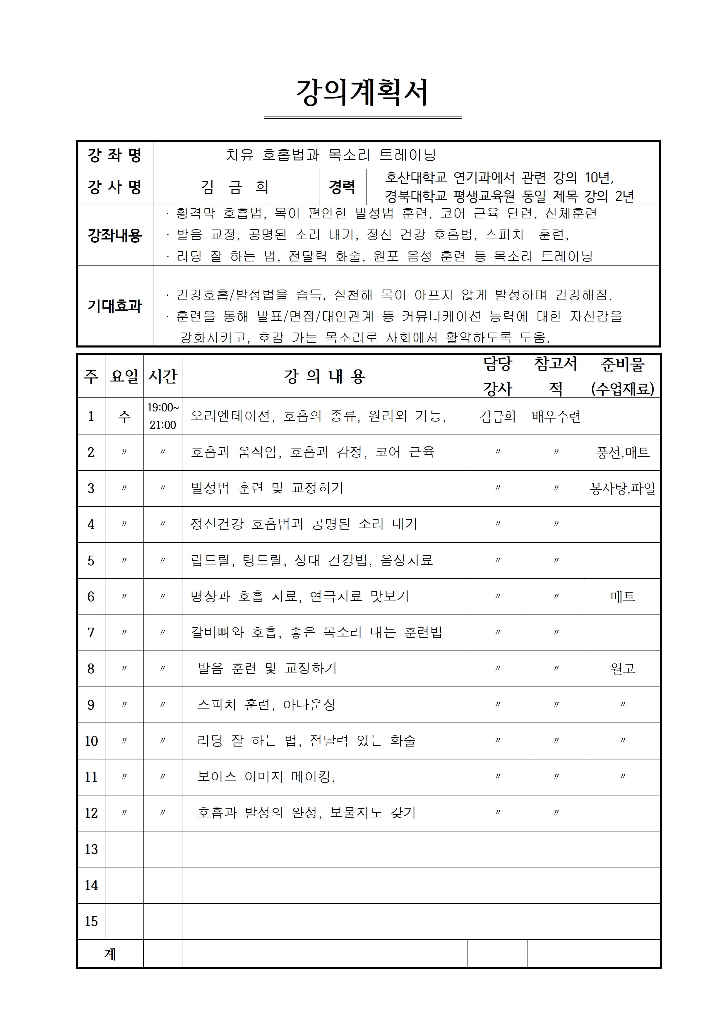 | 과정구분 | 일반교양과정 | 과정명 | 치유 호흡법과 목소리 트레이닝 |