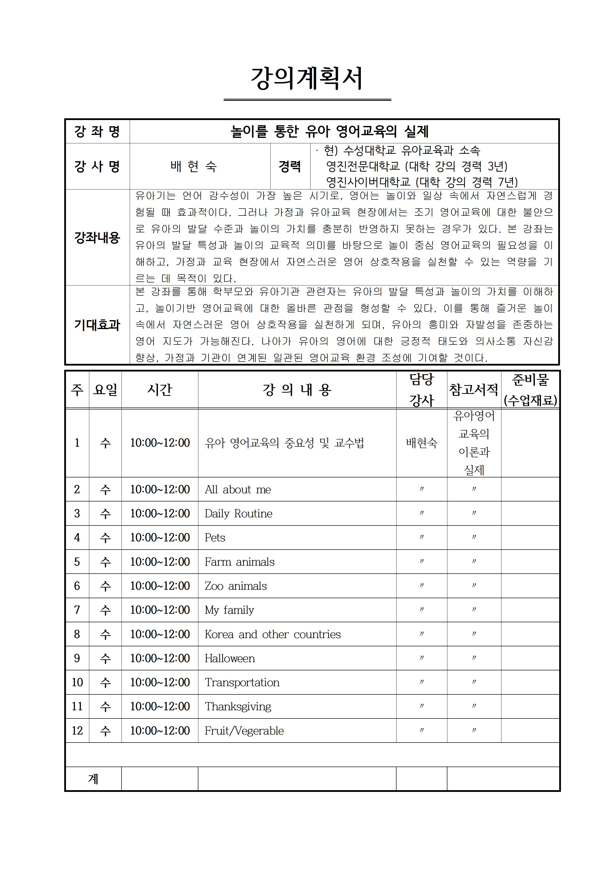 | 교육장소 | 경복관 414호 | 담당강사 | 배현숙 |
