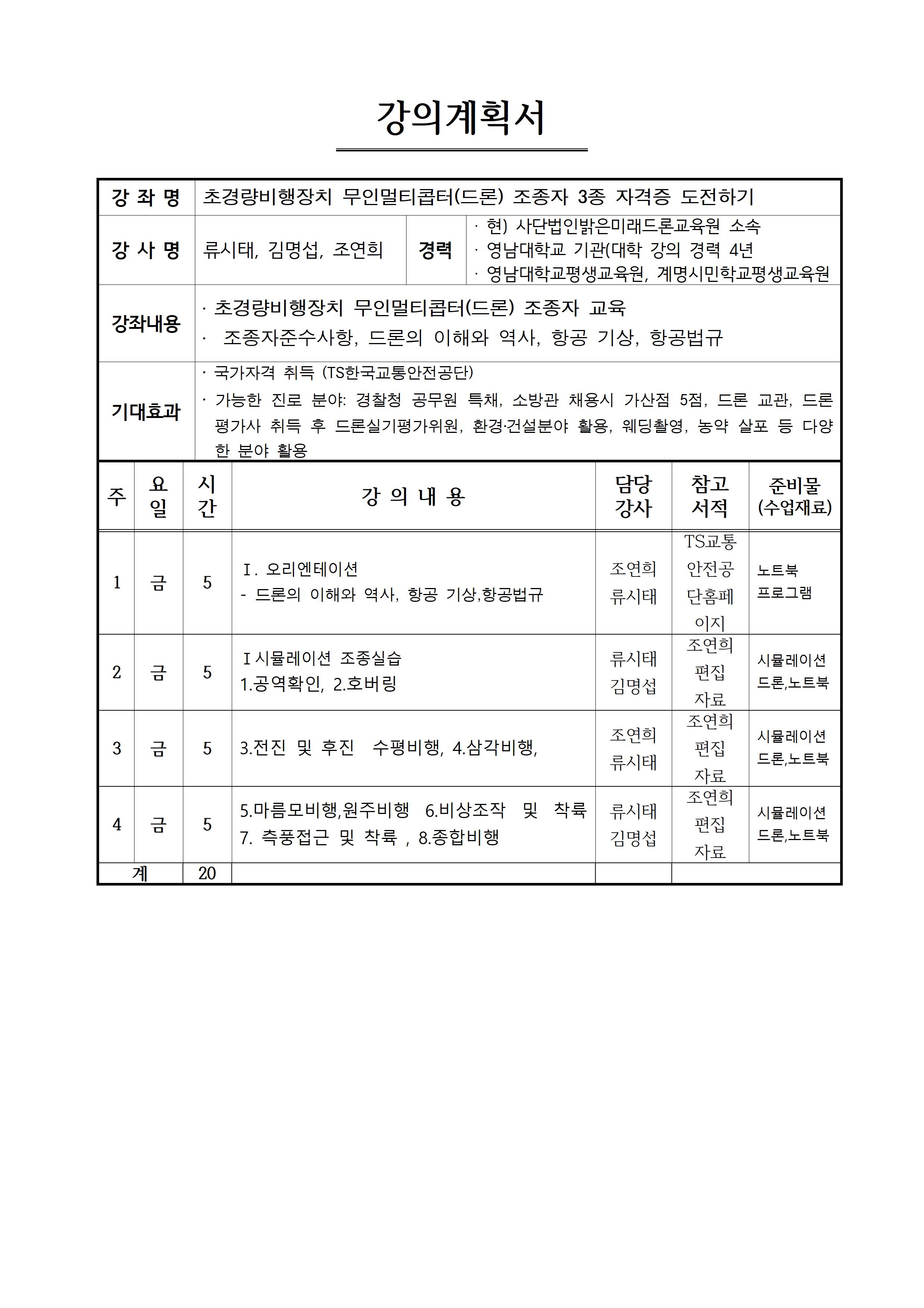 | 과정구분 | 자격증취득과정 | 과정명 | 초경량비행장치 무인멀티콥터(드론) 조종자 3종 자격증 도전하기 |