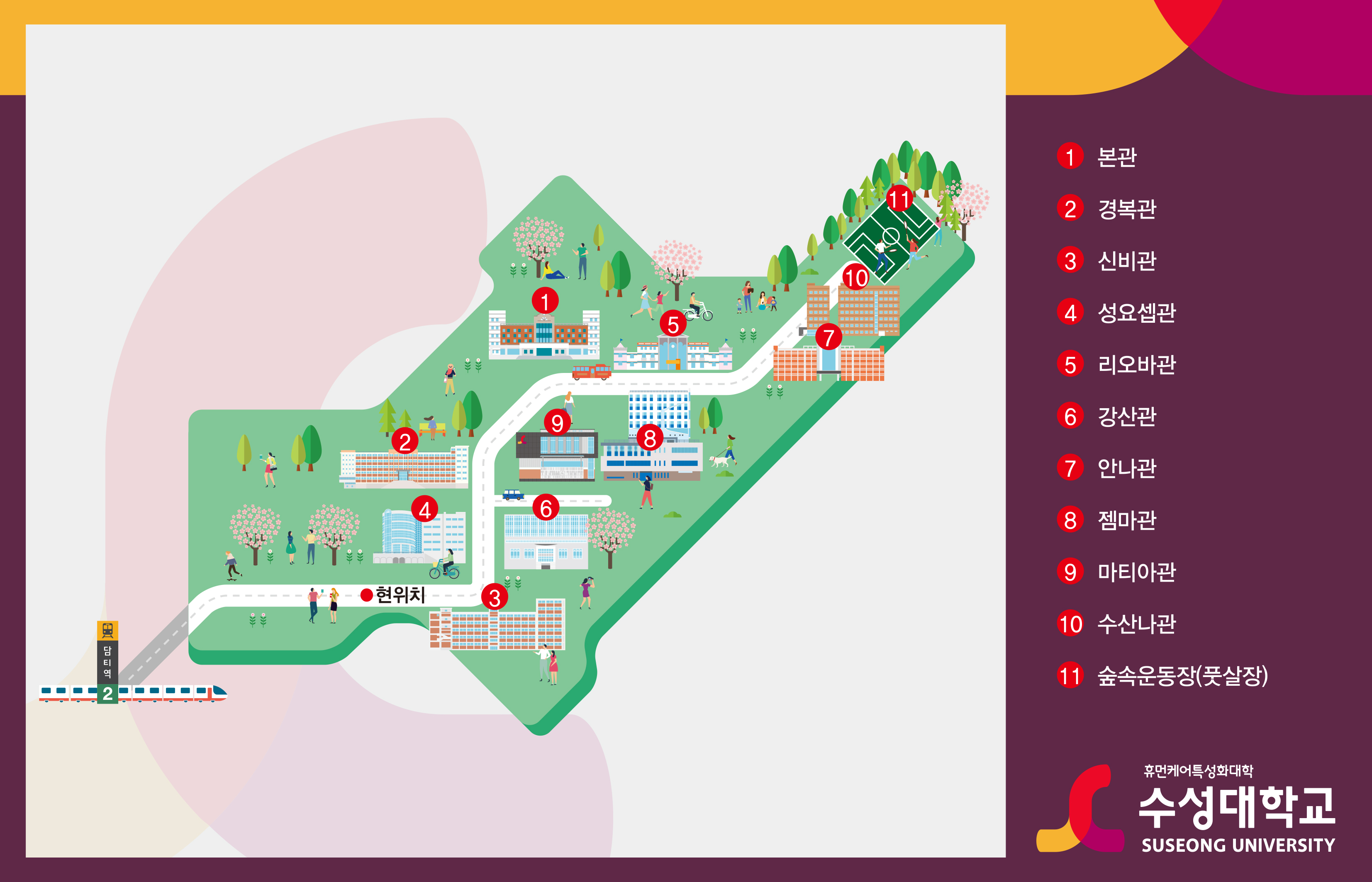 수성대학교 안내도 페이지 정보 작성자 최고관리자 댓글 0건 조회 95회 작성일 25-08-29 13:49 목록 본문 이전글[보육교직원 보수교육] ★보육교직원 보수교육 수료증명서 재발급 방법★ 25.08.29 다음글[보육교직원 보수교육] 2025년도 승급, 원장사전직무교육 일정 및 신청안내 25.08.29 위치 경복관 전화 053-749-7068 팩스 053-749-7064